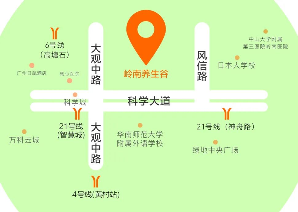 ● 自驾车:请导航至“岭南养生谷”(地址:黄埔区风信路10号日本人学校对面);